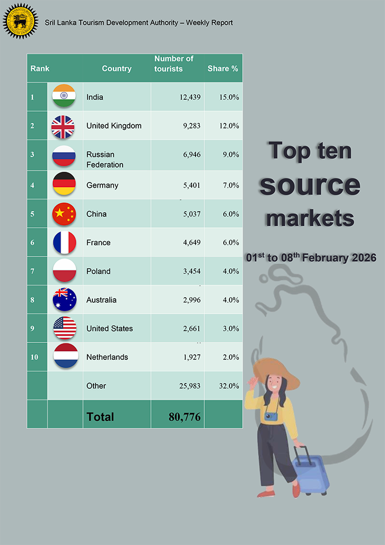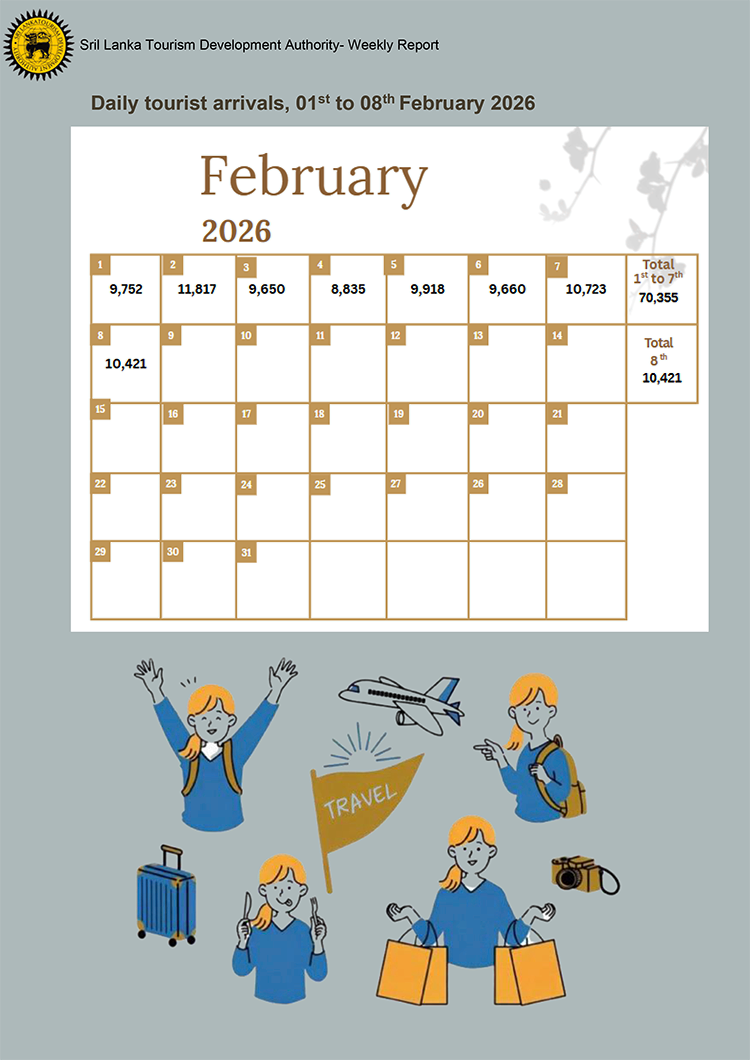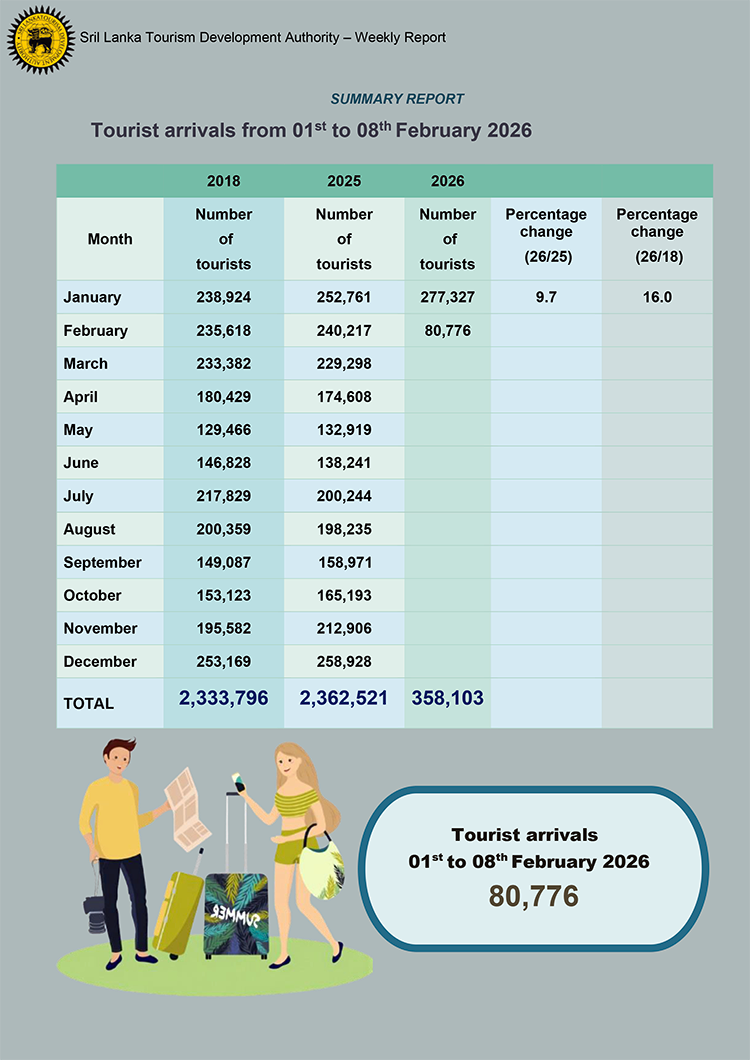 2026 පෙබරවාරි මාසයේ පළමු දින 8 තුළ 80,776ක සංචාරකයින් පිරිසක් මෙරටට පැමිණ ඇති බව ශ්රී ලංකා සංචාරක සංවර්ධන අධිකාරිය සිය නවතම දත්ත වාර්තාවන් නිකුත් කරමින් පවසයි.