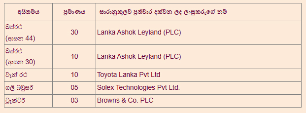 ඒ සඳහා ලංසුකරුවන් 08දෙනෙකු විසින් ලංසු ඉදිරිපත් කරනු ලැබ තිබේ. ඒ අනුව, එකී ලංසු සම්බන්ධයෙන් ඉහළ මට්ටමේ ස්ථාවර ප්රසම්පාදන කමිටුව විසින් ඉදිරිපත් කරනු ලැබ ඇති නිර්දේශ මත පදනම්ව බන්ධනාගාර දෙපාර්තමේන්තුව සඳහා වාහන මිල දී ගැනීමේ ප්රසම්පාදනය පහත සඳහන් පරිදි පිරිනැමීම පිණිස අධිකරණ සහ ජාතික ඒකාබද්ධතා අමාත්යවරයා ඉදිරිපත් කළ යෝජනාව අමාත්ය මණ්ඩලය විසින් අනුමත කරන ලදී: