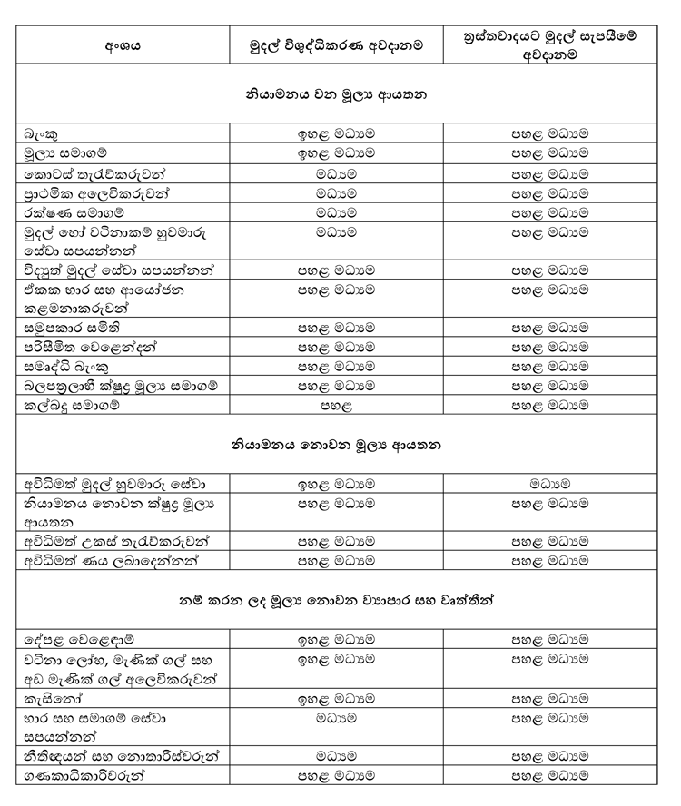 මූල්ය ආයතන සහ නම් කරන ලද මූල්ය නොවන ව්යාපාර සහ වෘත්තීන් යන අංශ වල මුදල් විශුද්ධිකරණ සහ ත්රස්තවාදයට මුදල් සැපයීමේ අවදානම පහත පරිදි වේ;