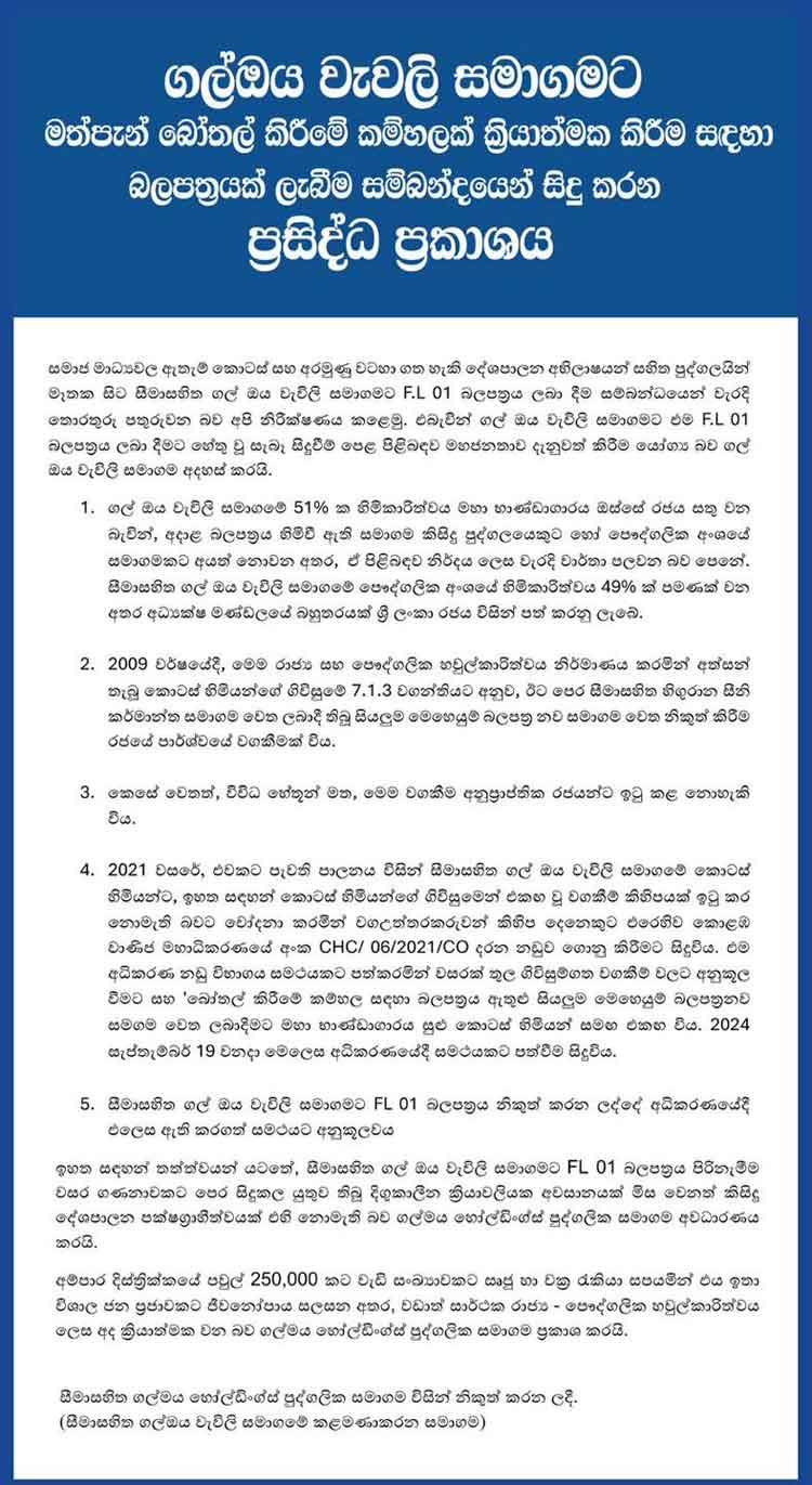 ගල් ඔය වැවලි සමාගමට මත්පැන් බෝතල් කිරීමේ කම්හලක් ක්රියාත්මක කිරීම සඳහා බලපත්රයක් ලැබීම සම්බන්දයෙන්, සීමාසහිත ගල් ඔය වැවිලි සමාගමේ කළමනාකරණ සමාගම වන සීමාසහිත ගල් ඔය හෝල්ඩිංග්ස් පුද්ගලික සමාගම විසින් ප්රසිද්ධ ප්රකාශයක් සිදුකර තිබේ.