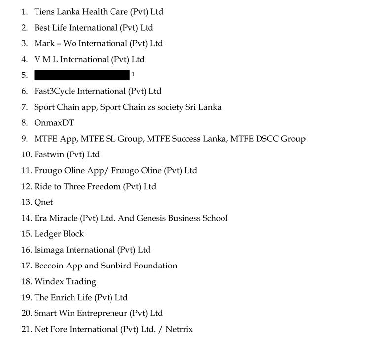 ශ්රී ලංකා මහ බැංකුව විසින් විමර්ශනයන් පැවැත්වීමෙන් අනතුරුව ආයතන “21“ ක් 1988 අංක 30 දරන බැංකු පනතේ 83 (ඇ) වගන්තිය උල්ලංඝනය කරමින් තහනම් පිරමීඩාකාර යෝජනා ක්රම පවත්වා ඇති බවට නිර්ණය කර ඇති බව ශ්රී ලංකා මහ බැංකුව පවසයි.