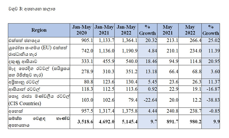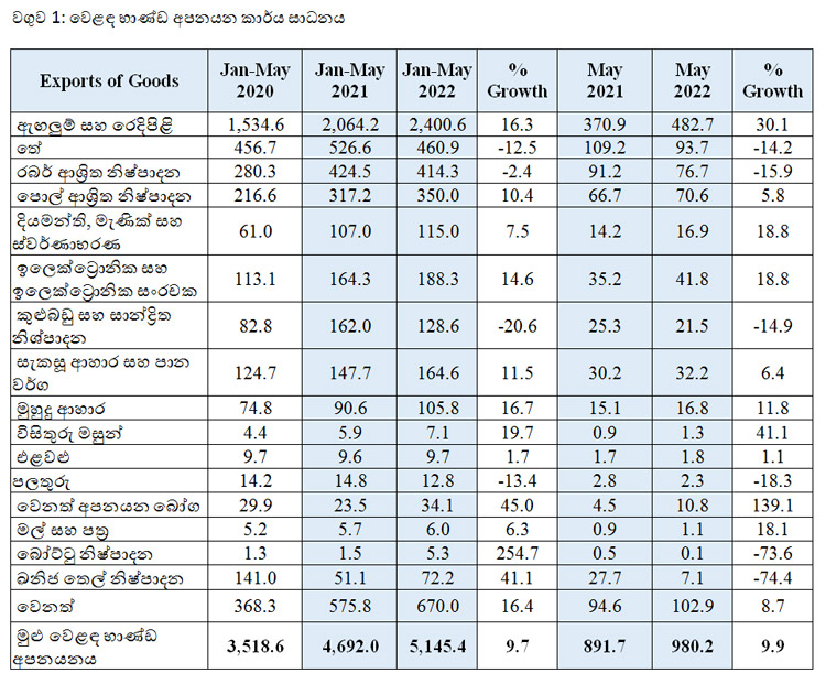 2022 මැයි මාසයේදී වෙළඳ භාණ්ඩ අපනයන ඉපැයීම් එක්සත් ජනපද ඩොලර් මිලියන 980.2 දක්වා 9.9% කින් පෙර වසරට සාපේක්ෂව වැඩි විය. මෙයට ප්රධාන වශයෙන් හේතු වූයේ ඇඟලුම් සහ රෙදිපිළි, පොල් ආශ්රිත නිෂ්පාදන සහ විදුලි සහ ඉලෙක්ට්රොනික සංරචක අපනයන ඉපැයීම් ඉහළ යාමයි.