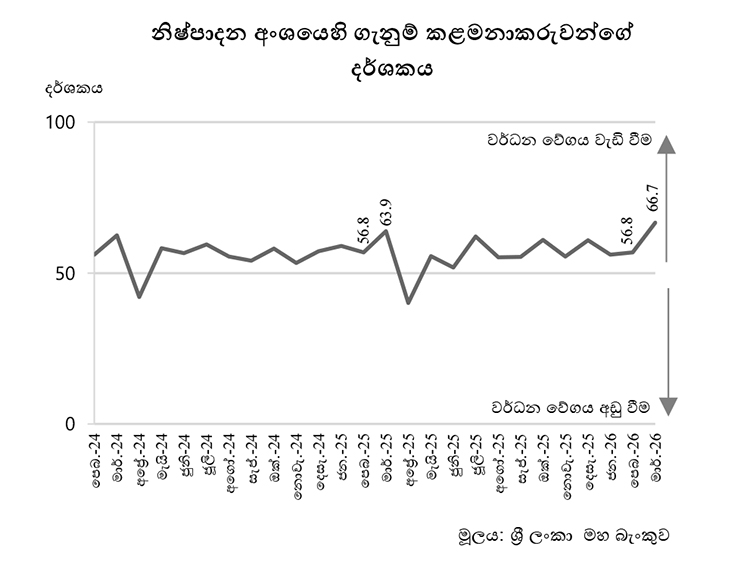 උත්සව සමයේ ඉහළ ඉල්ලුමත් සමග නිෂ්පාදන අංශයේ ක්රියාකාරකම් ඉහළ යෑම හේතුවෙන්, නිෂ්පාදන අංශයේ ශ්රී ලංකා ගැනුම් කළමනාකරුවන්ගේ දර්ශකය 2026 මාර්තු මාසයේ දී දර්ශකාංක 66.7ක් දක්වා ඉහළ ගියේය. කෙසේ වෙතත්, ප්රධාන වශයෙන් අමුද්රව්ය සහ ඉන්ධන හිඟය, ඉහළ යන නිෂ්පාදන පිරිවැය සහ සැපයුම් සීමාවන් හේතුවෙන්, සමීක්ෂණයට ප්රතිචාර දැක්වූ බොහෝ දෙනෙකු විසින් සීමාකාරී නිෂ්පාදන වාතාවරණයක් පිළිබඳව වාර්තා කරන ලදී.