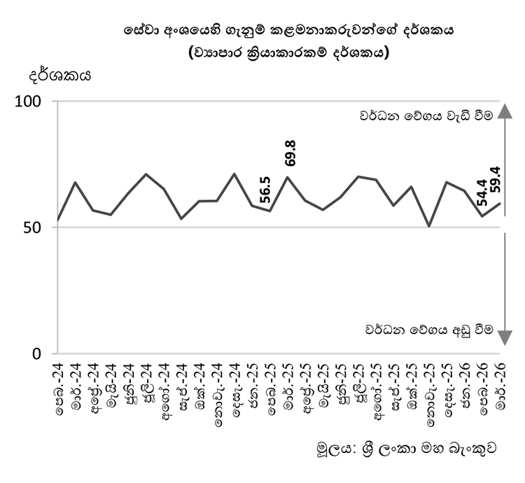 සේවා අංශයෙහි ශ්රී ලංකා ගැනුම් කළමනාකරුවන්ගේ දර්ශකය, පෙර මාසයට සාපේක්ෂව සේවා ක්රියාකාරකම්වල වර්ධනයක් පෙන්නුම් කරමින්, 2026 මාර්තු මාසයේ දී දර්ශකාංක 59.4ක අගයක් වාර්තා කළේය.