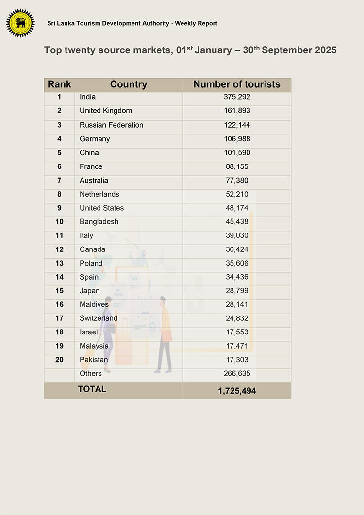සංචාරක සංවර්ධන අධිකාරිය නිකුත් කර ඇති නවතම දත්ත වාර්තාවන්ට අනුව 2025 වසරේ මේ දක්වා මෙරටට පැමිණ ඇති සමස්ත සංචාරකයින් සංඛ්යාව 1,725,494ක් ලෙස වාර්තා වෙයි.