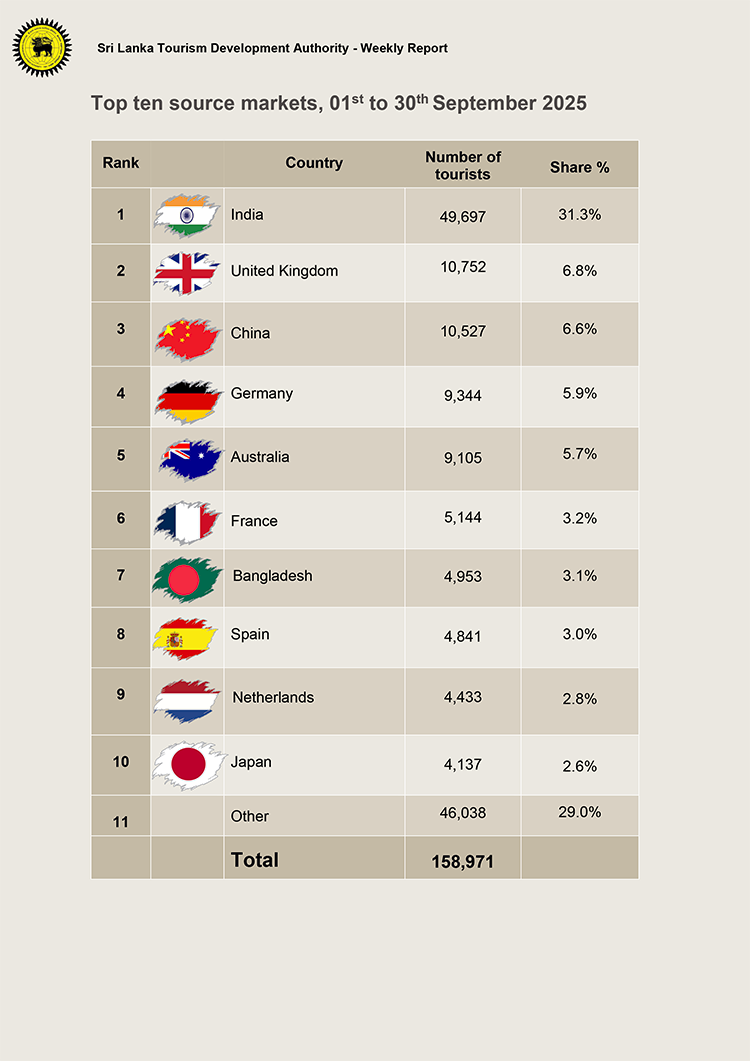 ඒ අනුව සැප්තැම්බර් මාසයේ මෙරටට පැමිණ ඇති සමස්ත සංචාරකයින් සංඛ්යාව දැක්වෙනුයේ 158,971ක් ලෙසයි.