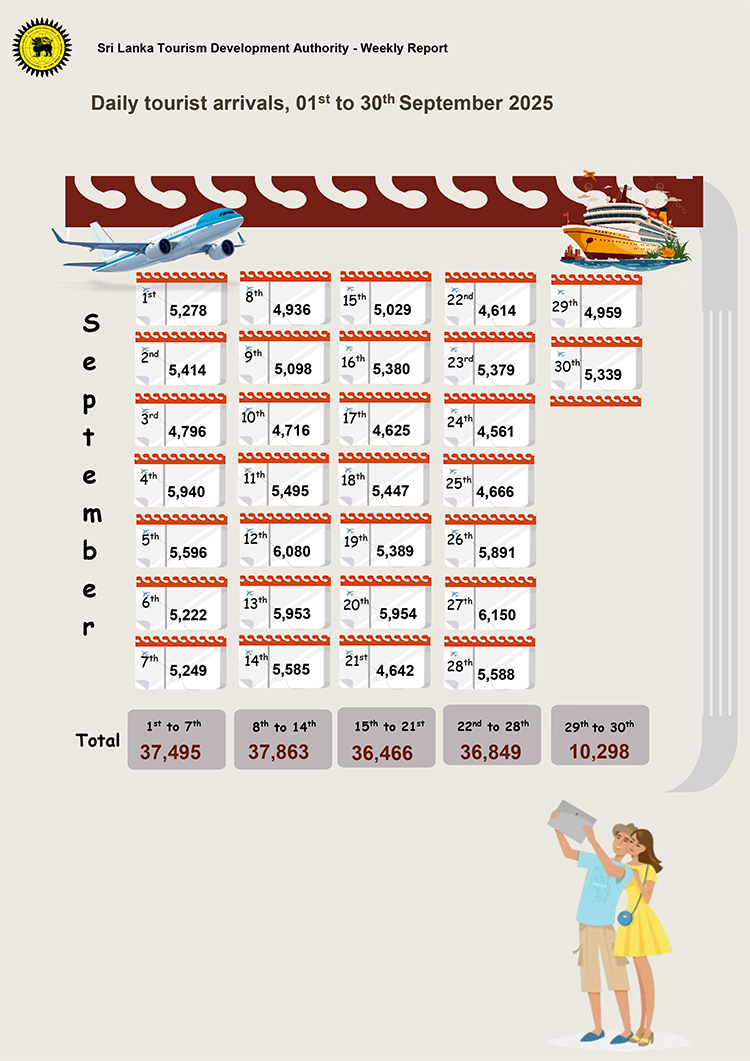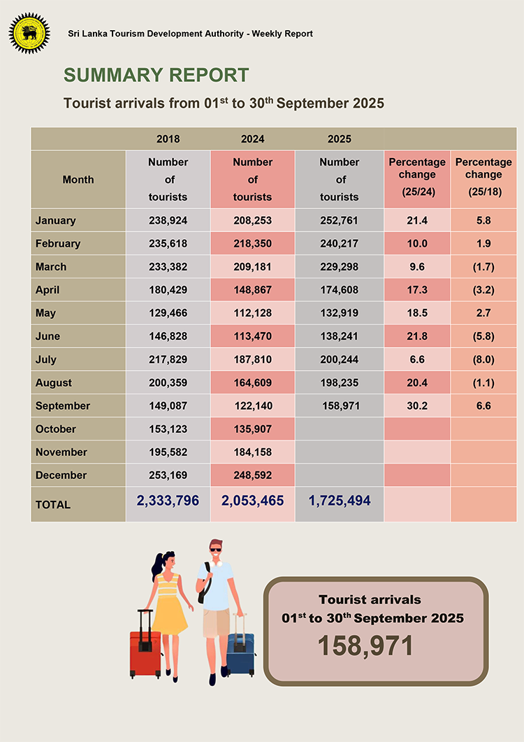2025 සැප්තැම්බර් මාසයේ මෙරටට පැමිණ ඇති සංචාරකයින් සංඛ්යාව 155,000 සීමාව ඉක්මවා ඇති බව ශ්රී ලංකා සංචාරක සංවර්ධන අධිකාරිය පවසයි.