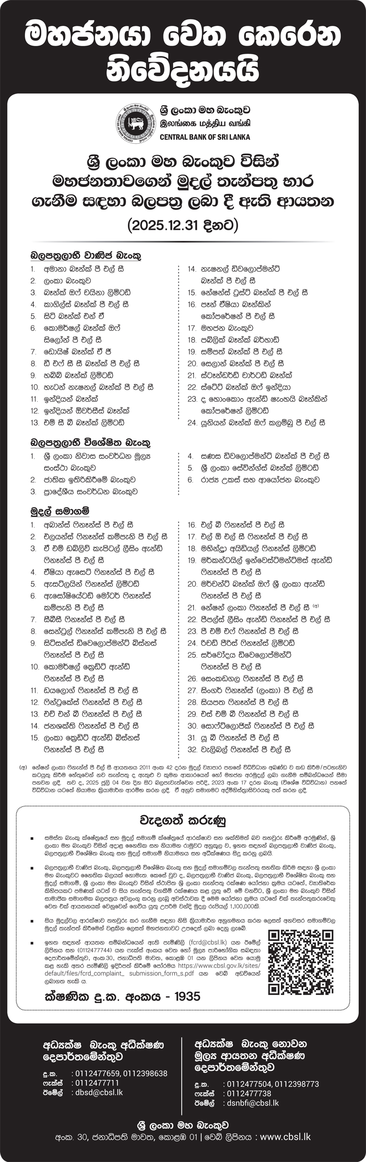 ශ්රී ලංකා මහ බැංකුව විසින් මහජනතාවගෙන් මුදල් තැන්පත් භාර ගැනීම සඳහා බලපත්ර ලබා දී ඇති ආයතන ලැයිස්තුවක් ප්රකාශයට පත් කර තිබේ.