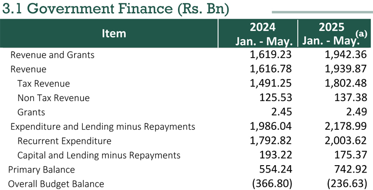 2025 ජනවාරි සිට මැයි දක්වා මාස 05ක කාලපරිච්ඡේදය තුළ දී රු. බිලියන 1,942.36ක රාජ්ය ආදායමක් වාර්තා වී ඇති බව ශ්රී ලංකා මහ බැංකුව පවසයි.