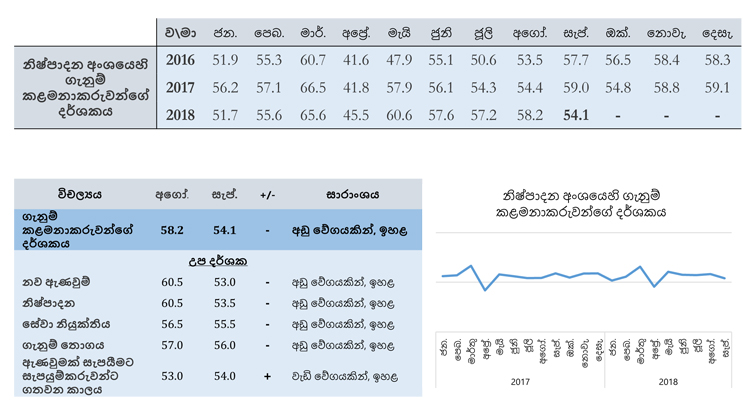 නිෂ්පාදන අංශයේ ගැනුම් කළමනාකරුවන්ගේ දර්ශකය, 2018 අගෝස්තු මස වාර්තා කළ 58.2ක අගයට සාපේක්ෂ ව 2018 සැප්තැම්බර් මාසයේ දී 54.1ක දර්ශක අගයක් දක්වා අඩු විය. මෙම අඩු වර්ධනය සඳහා, විශේෂයෙන් ම ආහාර සහ පාන අංශය ඇතුළු ව නව ඇණවුම් සහ නිෂ්පාදනවල වර්ධනය අඩු වීම හේතු විය.
