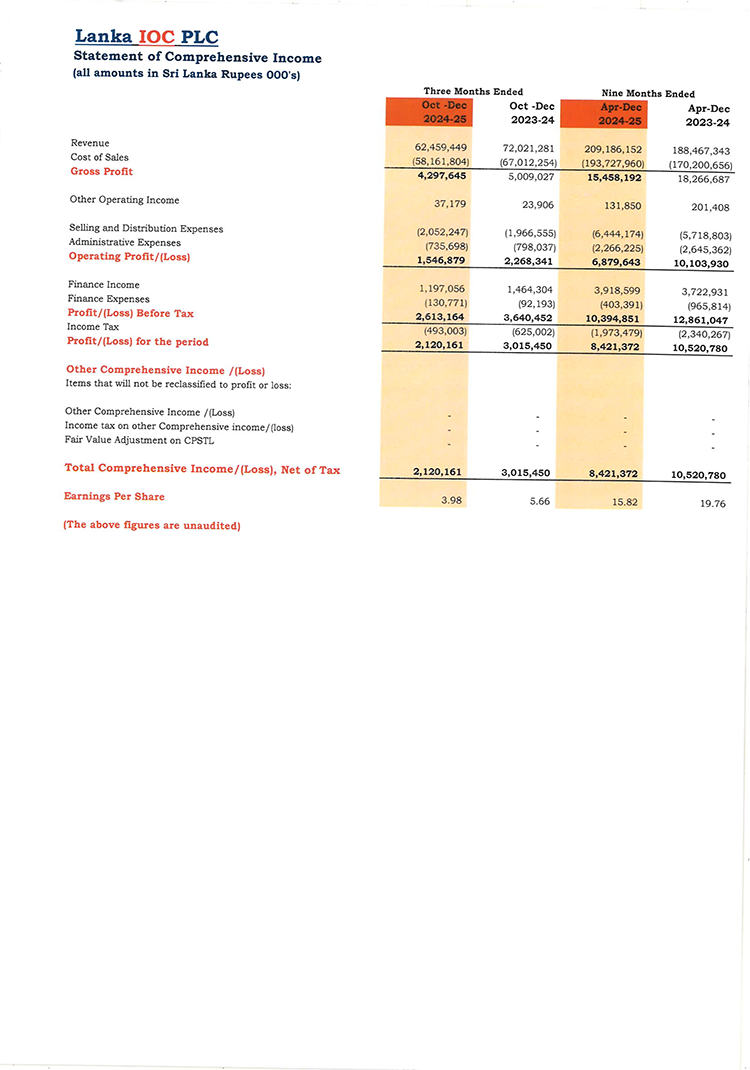 2024 ඔක්තෝම්බර් - දෙසැම්බර් කාර්තුවේ දී ලංකා IOC සමාගම රු. බිලියන 62.45ක ආදායමක් වාර්තාකර ඇති අතර එය 2023 ඔක්තෝම්බර් - දෙසැම්බර් කාර්තුවේ දී වාර්තා වී ඇත්තේ රු. බිලියන 72.02ක් ලෙසයි.