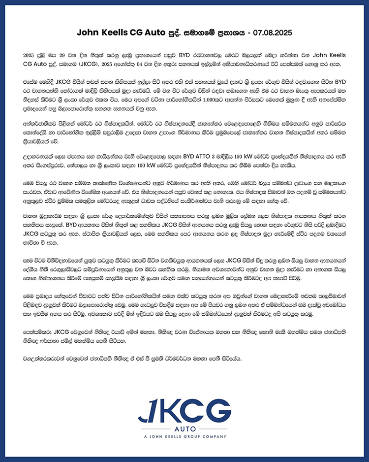 මේ සම්බන්ධයෙන් John Keells CG Auto (Pvt) Ltd (JKCG) විසින් නිකුත් කරනු ලැබූ ප්‍රකාශයක් පහතින් දැක්වේ;