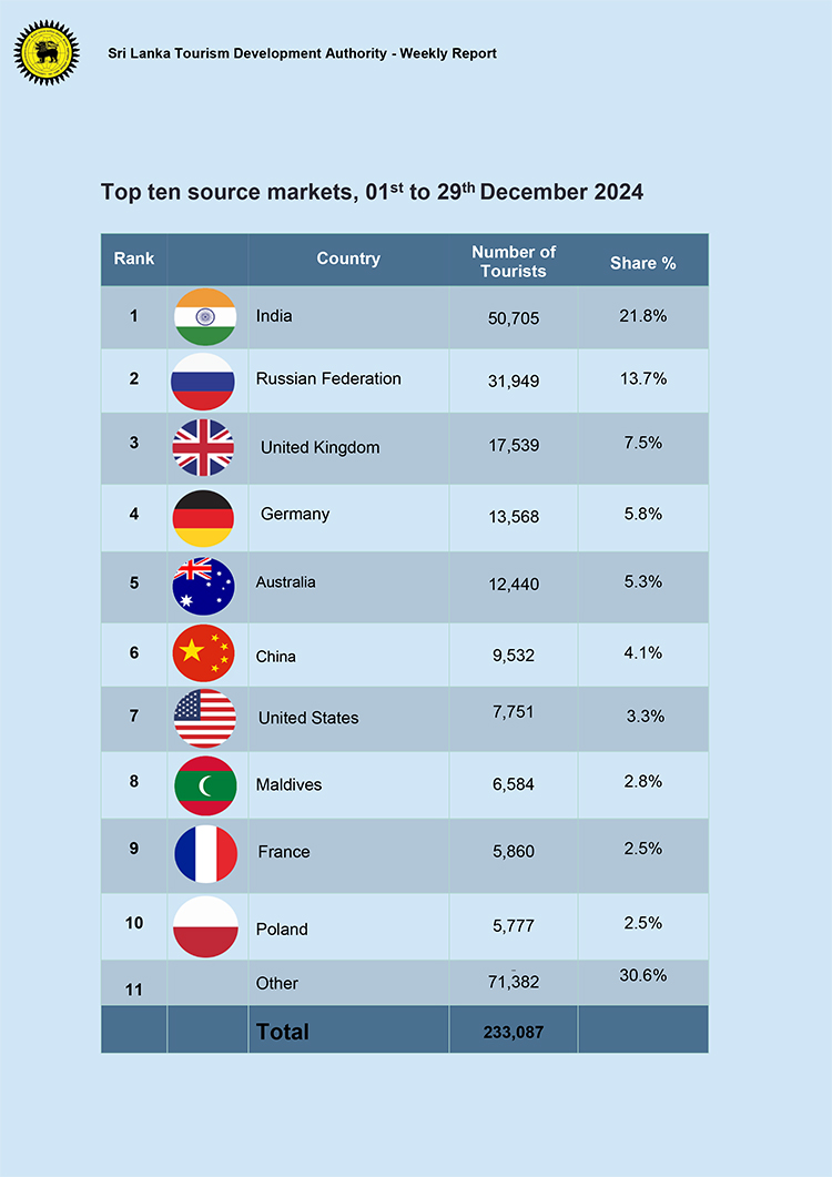 ඒ අනුව 2024 දෙසැම්බර් මාසයේ වැඩිම සංචාරකයින් පිරිසක් පැමිණ ඇත්තේ ඉන්දියාවෙන් වන අතර එම සංඛ්යාව දැක්වෙනුයේ 52,881ක් ලෙසයි.