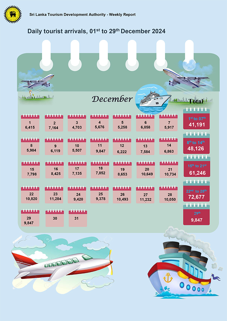 තව ද 2018 වසරින් පසු එක් මසක දී වැඩිම සංචාරක පැමිණීමක් වාර්තා කරමින් 2024 දෙසැම්බර් මාසයේ දී සංචාරකයින් 248,592ක් මෙරටට පැමිණ ඇති බව ද ශ්රී ලංකා සංචාරක සංවර්ධන අධිකාරිය සිය නවතම දත්ත වාර්තාව මගින් වැඩි දුරටත් පෙන්වා දී ඇත.