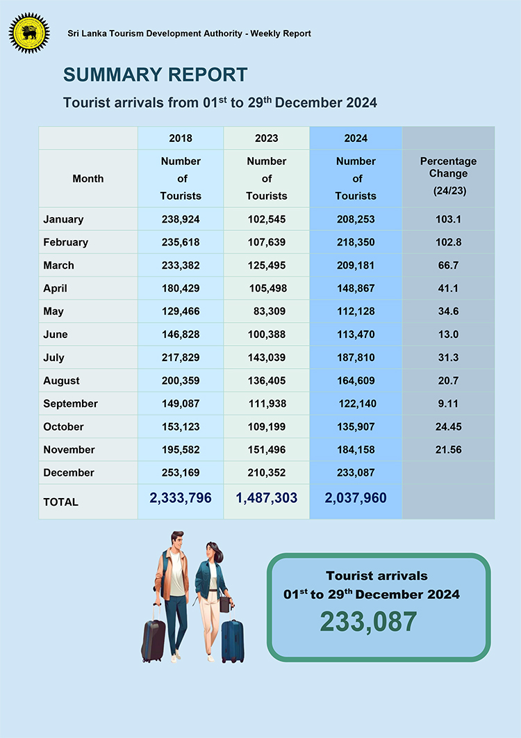 2018 වසරින් පසු වසරක් තුළ ශ්රී ලංකාවට පැමිණි වැඩිම සංචාරකයින් ප්රමාණය සනිටුහන් කරමින් 2024 වසර තුළ සංචාරකයින් 2,053,465ක් මෙරටට පැමිණ ඇති බව ශ්රී ලංකා සංචාරක සංවර්ධන අධිකාරිය පවසයි.