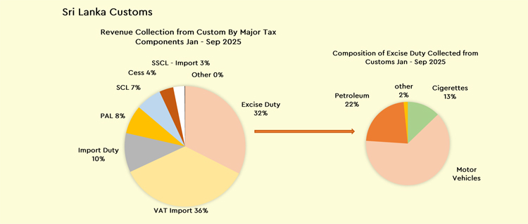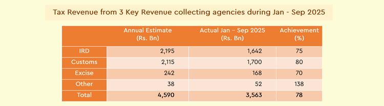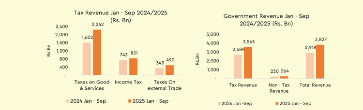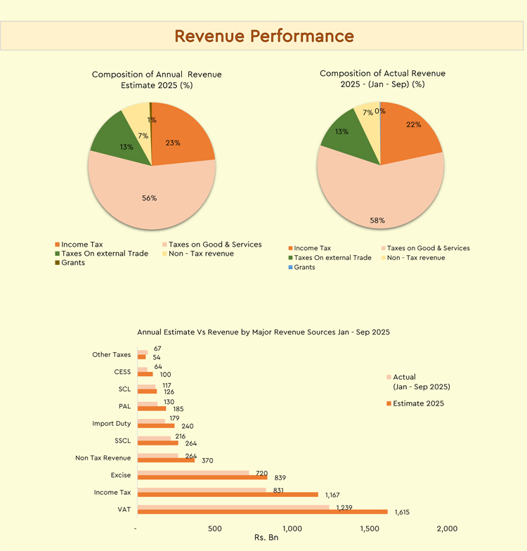 රජයේ බදු ආදායමට ඉහළම දායකත්වය VAT බදු මගින් ලැබී ඇති අතර එය රු. බිලියන 1,615කි. මීට අමතරව ආදායම් බදු මගින් රු. බිලියන 1,167ක් 2025 ජනවාරි - සැප්තැම්බර් කාලපරිච්ඡේදය තුළ දී ලබා ගැනීමට රජයට හැකිවී ඇත.