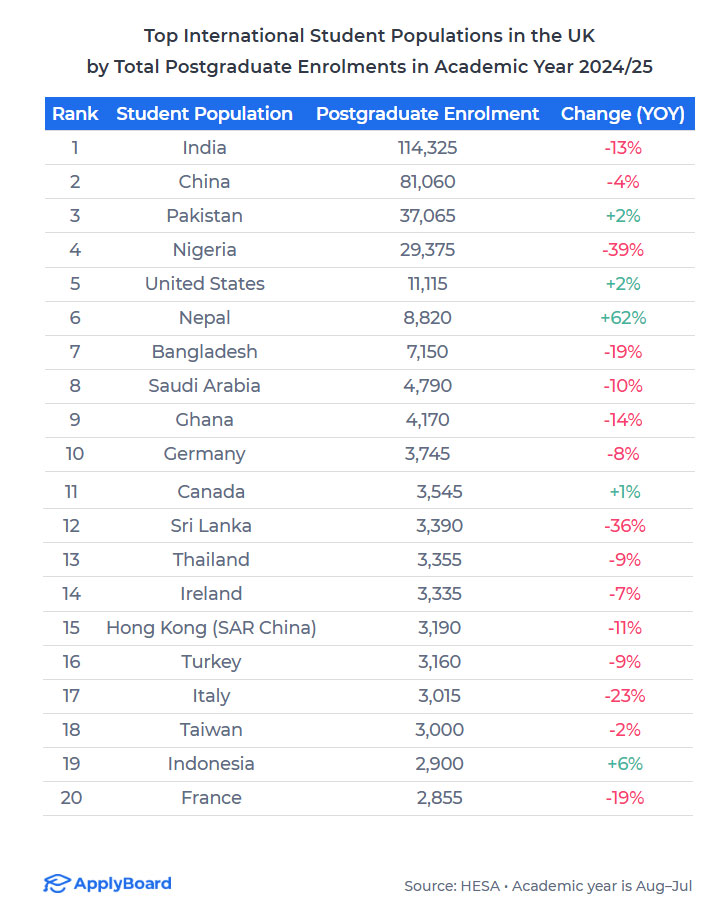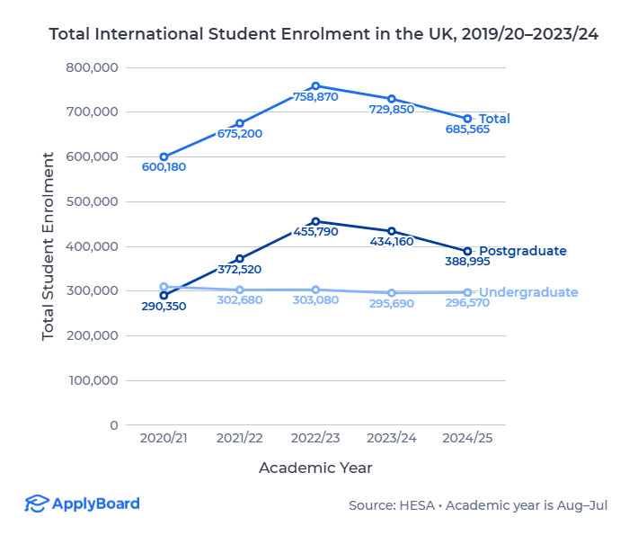 මේ සම්බන්ධයෙන් Apply Board Inc විසින් කරන ලද අධ්යයනයක දී අනාවරණය වී ඇත්තේ 2024/25 අධ්යයන වර්ෂයේ දී පශ්චාත් උපාධි අධ්යයනය සඳහා ජාත්යන්තර සිසුන්ගේ බඳවා ගැනීම් සමස්තයක් ලෙස 10%කින් පහත වැටී ඇති බවයි. එය එක්සත් රාජධානිය තුළ මුළු ජාත්යන්තර ශිෂ්ය සංඛ්යාව 6%කින් පහත වැටීමට ද ප්රධාන වශයෙන් හේතු වී ඇති බව සඳහන් වේ.