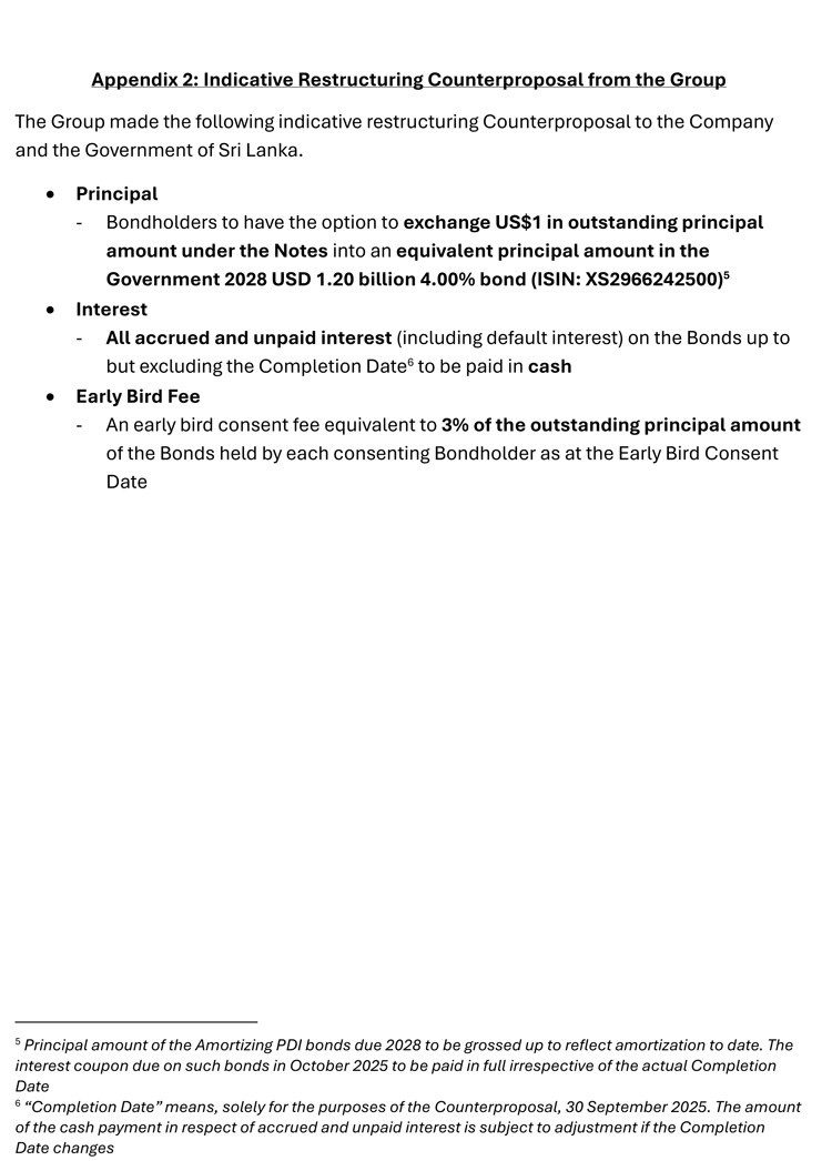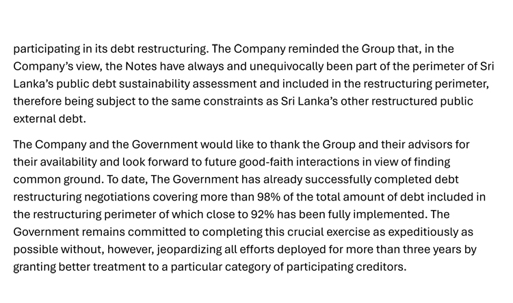මෙම ප්රතිව්යූහගතකරණය සම්බන්ධයෙන් අදාළ බැඳුම්කර හිමියන්ගේ යෝජනා සහ ශ්රී ලංකාවේ පාර්ශවය විසින් ඉදිරිපත් කරන ලද යෝජනා අතර සැලකිය යුතු වෙනස්කම් පැවතීම හේතුවෙන් මෙලෙස අවසන් එකඟතාවයකට පැමිණීමෙන් තොරව අදාළ සාකච්ඡා අවසන් වී ඇති බව වැඩිදුරටත් වාර්තා වේ.