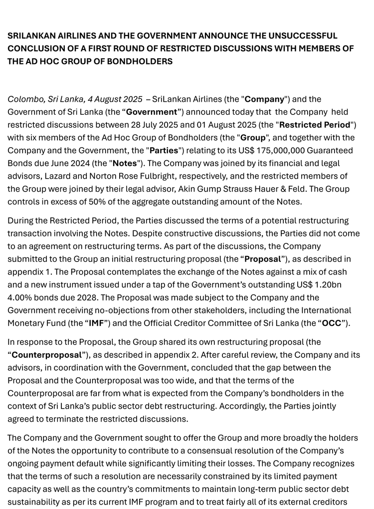 ශ්රීලංකන් ගුවන් සේවය විසින් මේ වන විට ගෙවීම් පැහැර හැර තිබෙන, ඩොලර් මිලියන 175ක සහතික කළ බැඳුම්කර, ප්රතිව්යූහගතකරණය සඳහා ප්රධාන බැඳුම්කර හිමියන් සමග පසුගිය දා පැවති සාකච්ඡා අසාර්ථක වී ඇති බව වාර්තා වේ. පසුගිය ජූලි 28 සිට අගෝස්තු 01 දක්වා පැවති මෙම සාකච්ඡාවල දී බැඳුම්කර හිමියන්ගේ කණ්ඩායම සමඟ අවසාන එකඟතාවයකට පැමිණීමට නොහැකි වී ඇති බව ශ්රී ලංකා රජය සහ ශ්රීලංකන් ගුවන්සේවය සිංගප්පූරු කොටස් වෙළෙඳපොළ වෙත දැනුම් දී තිබේ.