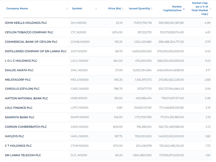 වෙළෙඳපොළ ප්‍රාග්ධනීකරණය අනුව කොළඹ කොටස් වෙළෙඳපොළේ විශාලතම සමාගම් 15 පහත පරිදි දැක්විය හැකිය.