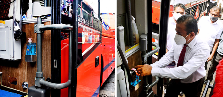 සේයාරු සටහන - (ඉහළ) සියැට් කැළණි හෝල්ඩින්ග්ස් සමාගමේ කළමණාකාර අධ්යක්ෂ රවී ඩඞ්ලානි මහතා (වමේ සිට තුන්වැන්නා) විසින් ශ්රී ලංකා ගමනාගමන මණ්ඩලයේ සභාපති කිංස්ලි රණවක මහතා වෙත සංකේතාත්මක පරිත්යාගයක් කරමින්. (වමේ සිට) සියැට් කැළණි හි නියෝජ්ය සාමාන්යාධිකාරී විකුණුම් – ඊ කලාපය ඉන්දික ඇල්ලේපොල මහතා සහ ප්රධාන මූල්ය නිලධාරී අරින්දම් චක්රබාර්ති මහතා සහ ශ්රී ලංකා ගමනාගමන මණ්ඩලයේ නියෝජ්ය සාමාන්යාධිකාරී මෙහෙයුම් - පණ්ඩුක ස්වර්ණහංස මහතා ද මෙම අවස්ථාවට සහභාගී විය. (පහළ, දකුණුපස) - ශ්රී ලංකා ගමනාගමන මණ්ඩලයේ සභාපති කිංස්ලි රණවක මහතා විසින් බස් රථයක් තුල සවිකර ඇති දෑත් සනීපාරක්ෂක උපකරණයක් පරීක්ෂා කරන අයුරු.