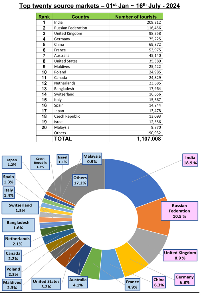 වසරේ මේ දක්වා පැමිණ ඇති සංචාරකයින්ගෙන් ඉන්දියාවෙන් 209,212 ක්, රුසියාවෙන් 116,456 ක්, එක්සත් රාජධානියෙන් 98,358 ක්, ජර්මනියෙන් 75,225 ක් සහා චීනයෙන් 69,872 ක් ලෙසින් ශ්රී ලංකාවේ ප්රධාන සංචාරක මූලාශ්ර ලෙසින් දැක්විය හැකිය.
