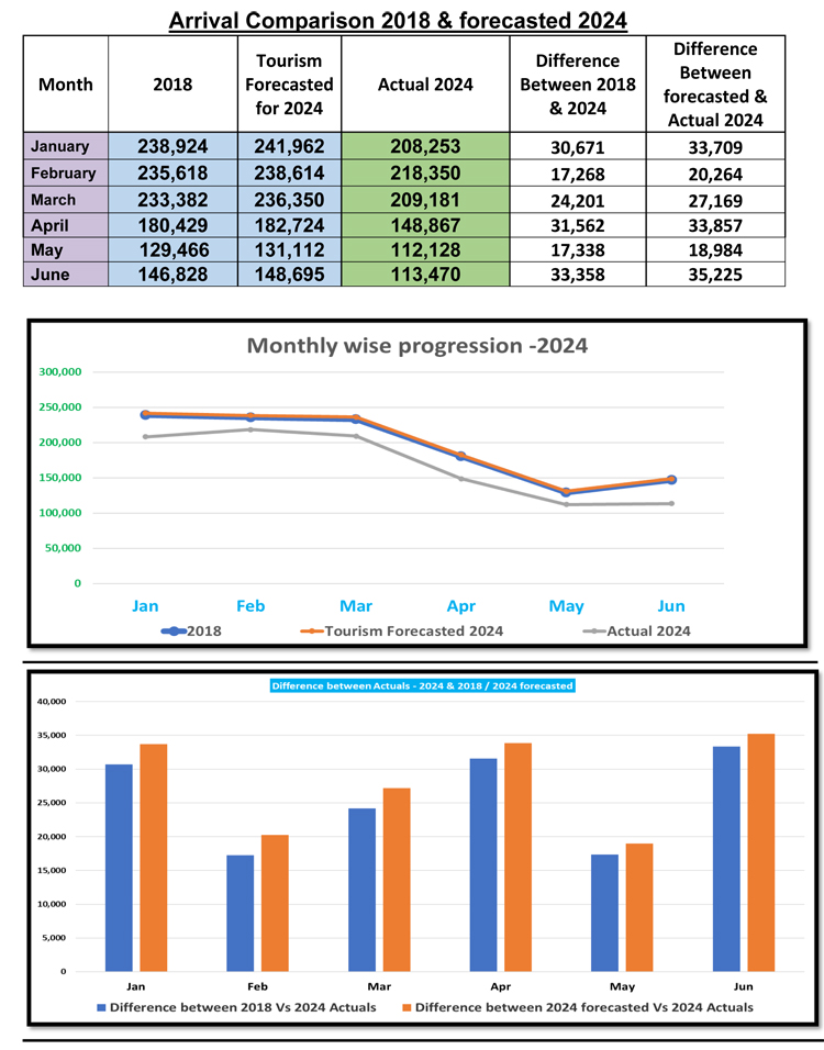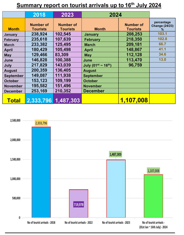 2024 ජූලි මාසයේ මුල් දින 16 තුළ දී සංචාරකයින් 96,759 ක් මෙරට පැමිණ ඇති අතර ඒ සමඟම වසරේ මේ දක්වා ශ්රී ලංකාවට පැමිණ ඇති සමස්ත සංචාරකයින් සංඛ්යාව 1,107,008 ක් දක්වා ඉහළ ගොස් තිබේ.