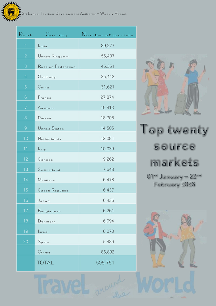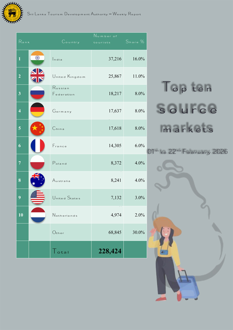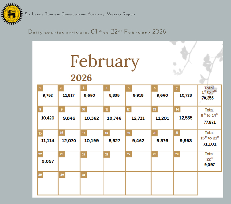 එහිදී 2026 පෙබරවාරි 01 සිට 22 දක්වා කාලපරිච්ඡේදය තුළ දී සංචාරකයින් 228,424ක් ශ්රී ලංකාවට පැමිණ ඇති බව එම සංඛ්යාලේඛන අනාවරණය කරයි. මෙහි ඇති විශේෂත්වය වන්නේ 2026 පෙබරවාරි මාසයේ ගෙවී ගිය සති තුනේ දී, එක් එක් සතිය තුළ සංචාරක පැමිණීම් සංඛ්යාව 70,000 සීමාව ඉක්මවා ගොස් තිබීමයි. ඒ පෙබරවාරි පළමු සතියේ 70,355ක්, දෙවන සතියේ 77,870ක් සහ තෙවන සතියේ 71,101ක් ලෙසිනි.