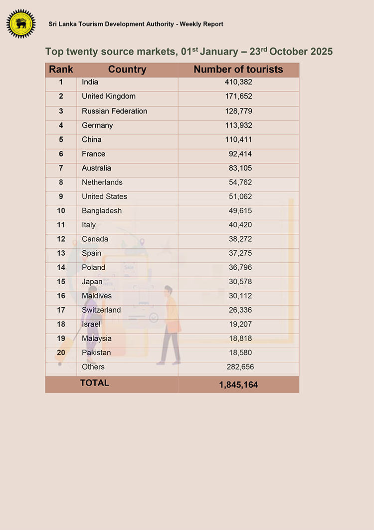 ඒ අනුම මේ දක්වා මෙරටට පැමිණ ඇති සමස්ත සංචාරකයින් සංඛ්යාව දැක්වෙනුයේ 1,845,164ක් ලෙසයි.