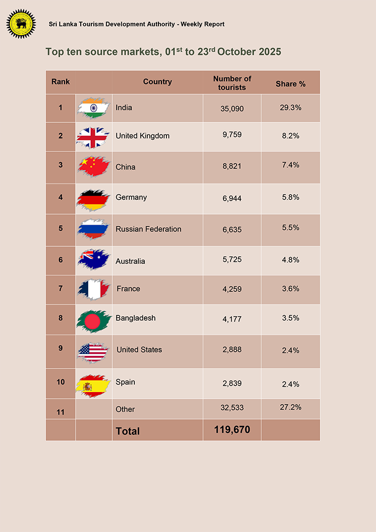 ඔක්තෝම්බර් මාසයේ පළමු දින 23 තුළ 29.3%ක එනම් 35,090ක ඉහළම සංචාරක පැමිණීමක් වාර්තා වී ඇති රට ලෙස ඉන්දියාව වාර්තා වී ඇත.