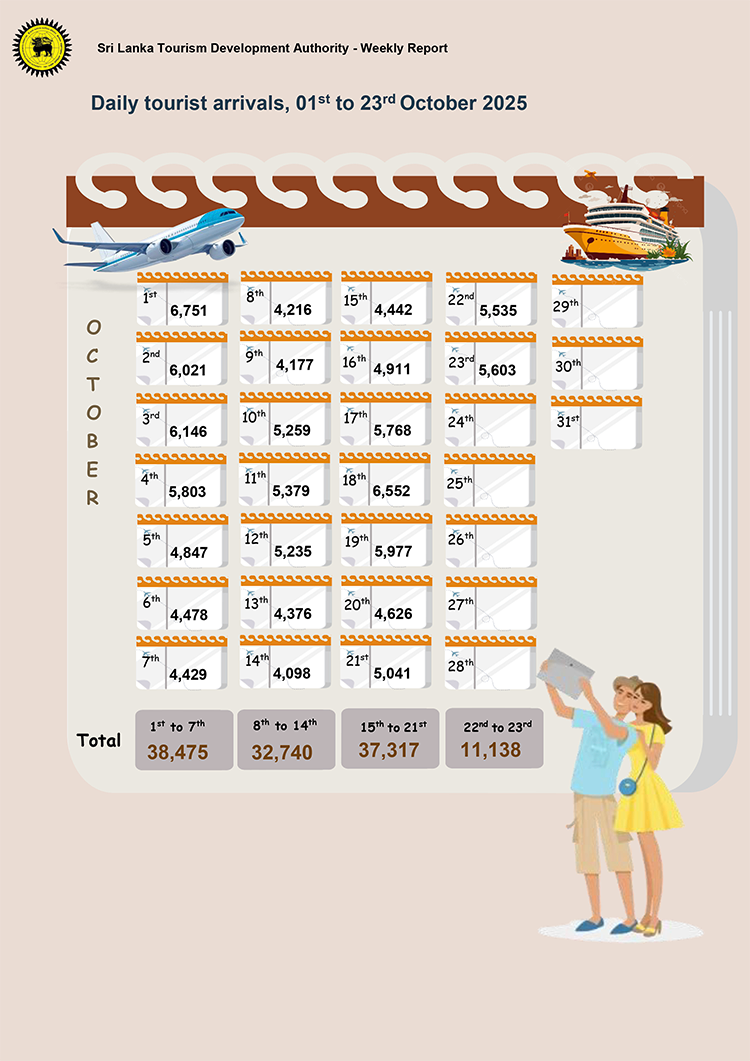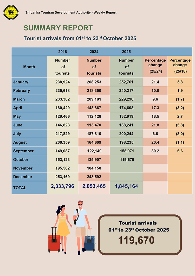 2025 ඔක්තෝම්බර් මාසයේ පළමු දින 23 තුළ 119,670ක සංචාරකයින් පිරිසක් මෙරටට පැමිණ ඇති බව ශ්රී ලංකා සංචාරක සංවර්ධන අධිකාරිය පවසයි.