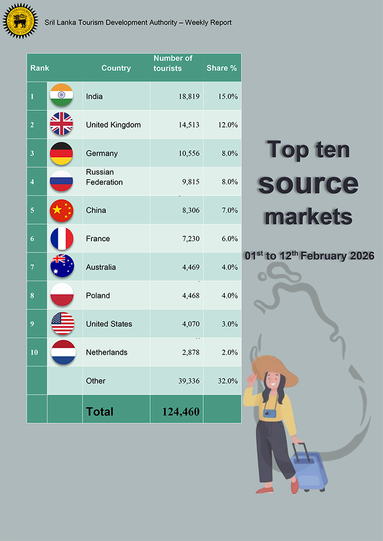 මේ අතර 2026 පෙබරවාරි මාසයේ පළමු දින 12 තුළ 124,460ක සංචාරකයින් පිරිසක් මෙරටට පැමිණ ඇති බව ශ්රී ලංකා සංචාරක සංවර්ධන අධිකාරිය සිය නවතම දත්ත වාර්තාවන් නිකුත් කරමින් පවසයි.