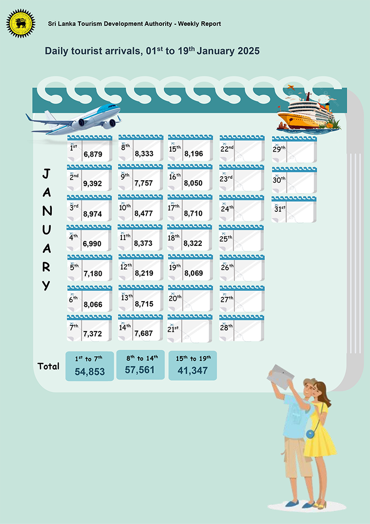 ජනවාරි මාසයේ ගත වූ පළමු සති දෙකෙහිම පනස්දහස ඉක්මවූ සංචාරකයින් පිරිසක් පැමිණ ඇති අතර තෙවන සතියේ පළමු දින පහ තුළ 41,347ක සංචාරකයින් පිරිසක් මෙරටට පැමිණ ඇත.