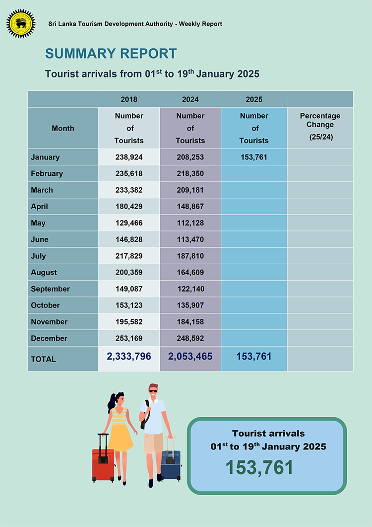 2025 වසරේ පළමු දින 19 තුළ දී සංචාරකයින් 153,761 ක් මෙරටට පැමිණ ඇති බව ශ්‍රී ලංකා සංචාරක සංවර්ධන අධිකාරිය සිය නවතම දත්ත වාර්තාව මගින් පෙන්වා දෙයි.