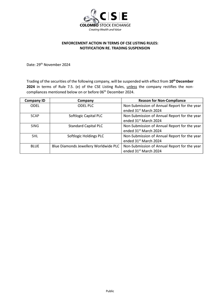 කොළඹ කොටස් වෙළෙඳපොළ පවසන්නේ අදාළ සමාගම් විසින් 2024 දෙසැම්බර් 06 වන දින වන විට අදාළ වාර්ෂික වාර්තා ඉදිරිපත් කිරීමට අපොහොසත් වුවහොත්, 2024 දෙසැම්බර් 10 වන දින සිට එම සමාගම්වල කොටස් ගනදෙනු අත්හිටුවනු ලබන බවයි.