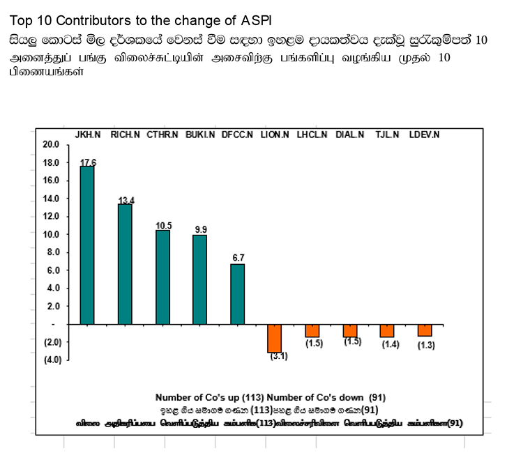 ජෝන් කීල්ස් හෝල්ඩිංග්ස්, රිචඩ් පීරිස් ඇන්ඩ් කම්පැනි, CT හෝල්ඩිංග්ස්, බුකිට් ඩාරා සහ DFCC බැංකුව යන සමාගම්වලින් අද සියලු කොටස් මිල දර්ශකයේ වර්ධනයට ඉහළ දායකත්වයක් ලැබී තිබුණි.