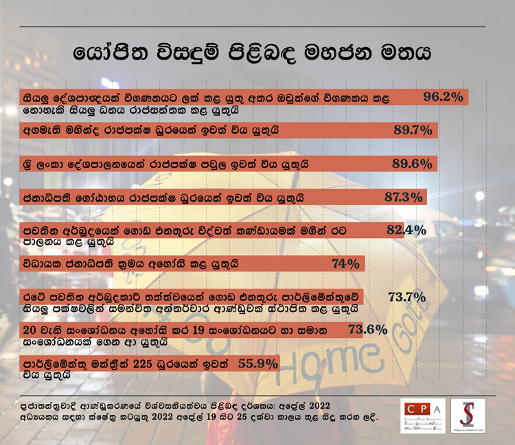 වර්තමාන අර්බුදය විසඳීම සඳහා විවිධ පාර්ශව විසින් ඉදිරිපත් කරන ලද යෝජනා කිහිපයක් කෙරෙහි මහජන සහයෝගය මෙම අධ්යනයෙන් පරීක්ෂා කරන ලදී. ශ්රී ලාංකිකයන්ගෙන් 96% කට වැඩි ප්රමාණයක් විශ්වාස කරන්නේ සියලූම දේශපාලනඥයන් විගණනයට ලක් කළ යුතු අතර ඔවුන්ගේ විගණනය කළ නොහැකි ධනය රජය විසින් රාජසන්තක කළ යුතු බවයි. ශ්රී ලාංකිකයන් දස දෙනෙකුගෙන් නව දෙනෙකුම දරන මතය වන්නේ අග්රාමාත්ය මහින්ද රාජපක්ෂ මහතා ඉල්ලා අස්විය යුතු බවත් රාජපක්ෂ පවුල ශ්රී ලාංකික දේශපාලනයෙන් ඉවත් විය යුතු බවත්ය. ජනාධිපති ගෝඨාභය රාජපක්ෂ මහතා ඉල්ලා අස්විය යුතු බවට කරන ලද යෝජනාවට 87% ක් සහය දක්වයි. එම නිසා මෙම සමීක්ෂණයෙන් පැහැදිලිවම පෙන්වා දෙන්නේ පවතින අර්බුදය විසඳීමේ දී රාජපක්ෂලාට කිසිදු කාර්යභාරයක් නොමැති බවත් ඔවුන් ඉවත් කිරීම වර්තමාන අර්බුදයෙන් මිදීමේ මාර්ගය ලෙසත් ජනතා සිත් තුළ පවතින බවයි. මීට වසර තුනකට පෙර ඔහුට වැඩි ඡුන්දට ලබා දුන් සිංහල බහුතරය ඇතුලූ සියලූම වාර්ගික ප්රජාවන් විසින් මෙම මතය දරන බව සැලකිල්ලට ගැනීම වැදගත්ය.