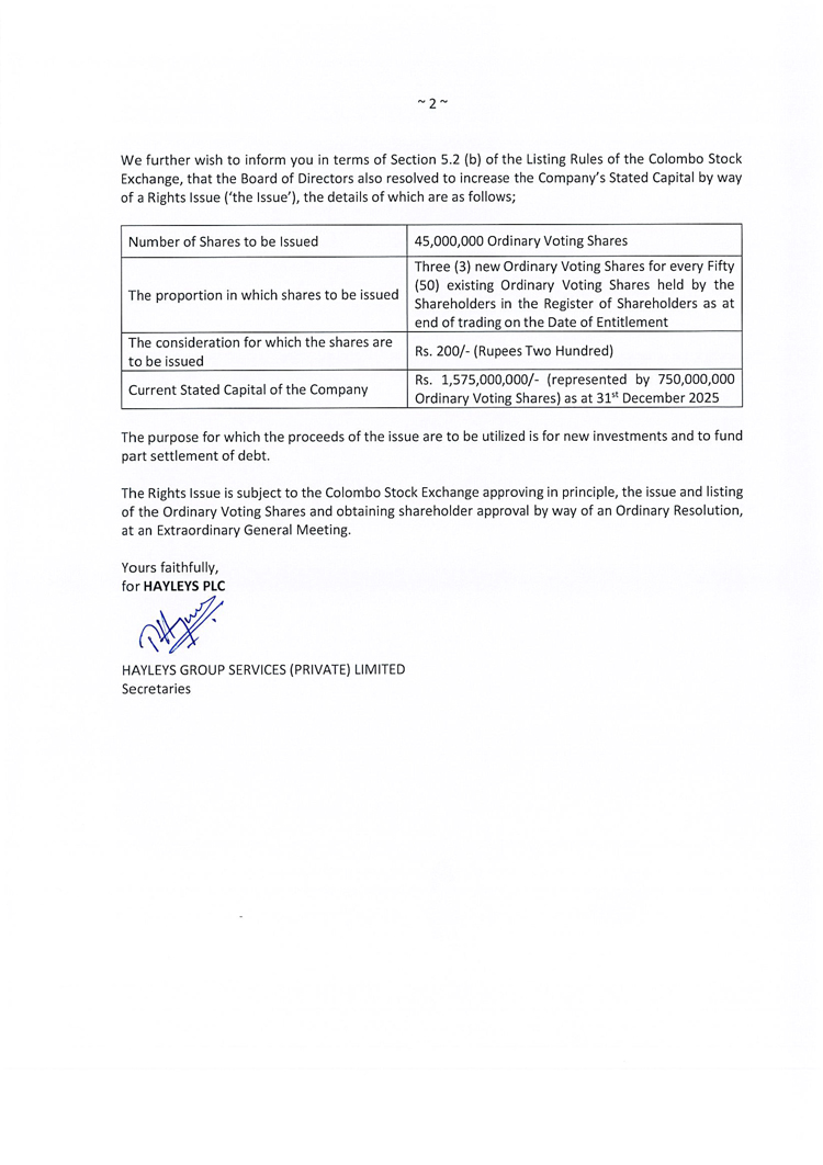 මේ අතර මීට සමගාමීව සමාගම විසින් රු. බිලියන 9ක ප්රාග්ධනයක් සම්පාදනය කර ගැනීම වෙනුවෙන් හිමිකම් නිකුතුවක් ද ප්රකාශයට පත් කර තිබේ. දැනට පවතින ඡන්ද බලය හිමි සෑම කොටස් 50කටම 3ක් බැගින් වන පරිදි මෙම හිමිකම් නිකුතුව සිදුකෙරෙන අතර එහිදී කොටස් මිලියන 45ක් අලුතෙන් නිකුත් කෙරෙනු ඇත. ඒ එක් කොටසක් රු. 200 බැගිනි.