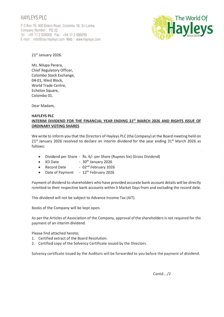 කොළඹ කොටස් වෙළෙඳපොළේ ලැයිස්තුගත ප්රමුඛතම විවිධාංගීකරණය කරන ලද සමාගම් සමූහයක් වන හේලීස් පීඑල්සී 2026 මාර්තු 31 දිනෙන් අවසන් මූල්ය වර්ෂය වෙනුවෙන් අතුරු ලාභාංශයක් ප්රකාශයට පත් කර තිබේ. එහිදී එක් කොටසක් වෙනුවෙන් රු. 6ක ලාභාංශයක් නිවේදනය කර ඇත.