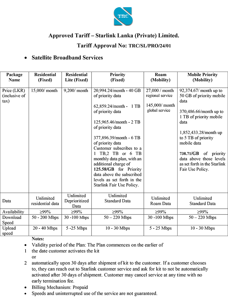 ශ්රී ලංකා විදුලි සංදේශ නියාමන කොමිෂන් සභාව (TRCSL) විසින් 'Starlink' Lanka (Private) Ltd හරහා ක්රියාත්මක කිරීමට නියමිත 'Starlink' චන්ද්රිකා බ්රෝඩ්බෑන්ඩ් සේවා පැකේජ සඳහා ගාස්තු සැලසුම් අනුමත කර ඇත.
