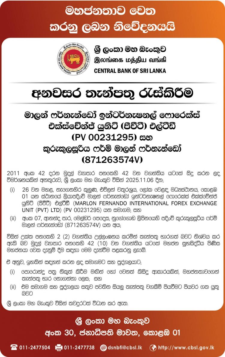 2011 අංක 42 දරන මුදල් ව්යාපාර පනතෙහි 42 වන වගන්තිය යටතේ සිදු කරන ලද විමර්ශනයකින් අනතුරුව, ශ්රී ලංකා මහ බැංකුව විසින් 2025.11.06 දින,