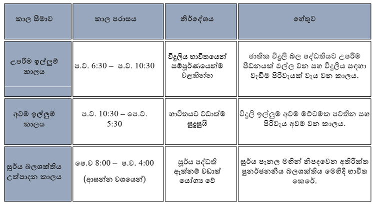 ඒ අනුව, විදුලි ඉල්ලුම උපරිම වන සවස 6:30 ත් රාත්රී 10:30 ත් අතර කාලය තුළ විදුලි වාහන charge කිරීමෙන් වළකින ලෙස පාරිභෝගිකයින්ගෙන් ඉල්ලා සිටින අතර ඒ වෙනුවට, විදුලි ඉල්ලුම අවම (off-peak) කාලසීමාව වන රාත්රී 10:30 ත් පසුදා අලුයම 5:30 ත් අතර කාලය තුළ විදුලි වාහන charge කිරීමට පාරිභෝගිකයින් දිරිමත් කරනු ලැබේ. එමෙන්ම, නිවසේ හෝ සේවා ස්ථානයේ සූර්ය බලශක්ති පද්ධති සවිකර ඇති පාරිභෝගිකයින්ට ද පෙ.ව. 8:00 ත් ප.ව. 4:00 ත් අතර කාලය තුළ සූර්ය බලයෙන් නිපදවෙන විදුලියෙන් උපරිම ප්රයෝජන ගන්නා පරිදි සිය වාහන charge කිරීමට සුදුසු පරිදි කාලසටහන් සකස් කරගත හැකිය.