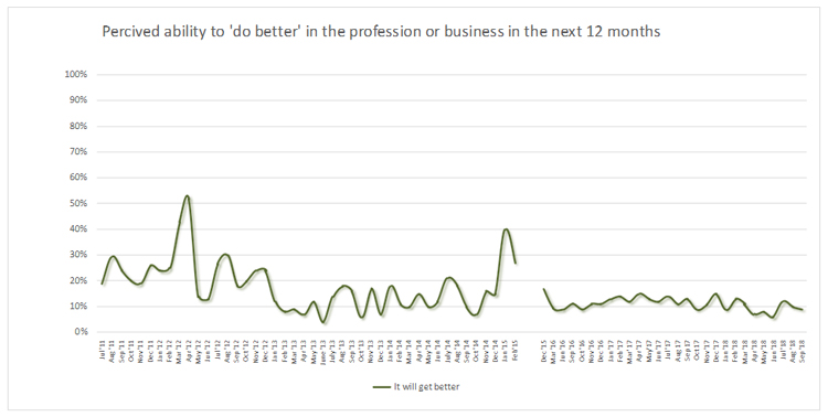 ඉදිරි මාස 12 සැලකිල්ලට ගත්කළ තම රැකියාවේ තත්ත්වය හෝ ව්යාපාරය වැඩි දියුණු කර ගැනීම කෙරෙහි ජනතාවගේ අපේක්ෂාව සමස්තයක් ලෙස 2018 තුන්වන කාර්තුව තුළදී (ජූලි, අගෝස්තු සහ සැප්තැම්බර්) 2018 දෙවන කාර්තුවට සාපේක්ෂව ඉහළ ගිය ආකාරය පහත ප්රස්ථාරය මගින් පැහැදිලි වේ.