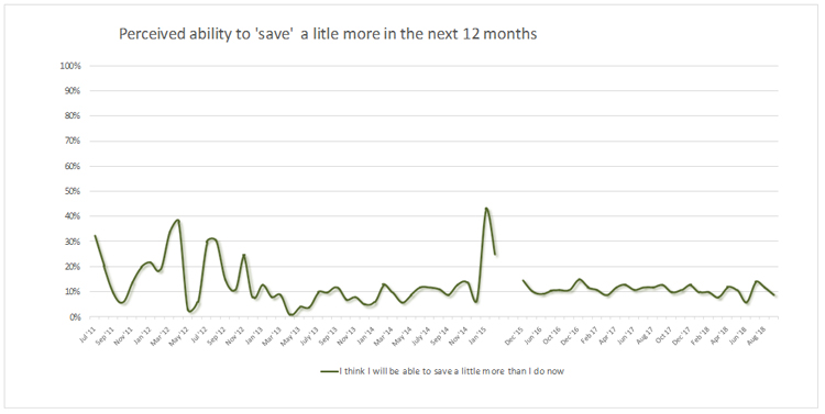 ඉදිරි මාස 12 ඇතුළත උපයන මුදලින් යම් කිසි ප්රමාණයක් ඉතිරි කිරීමට තිබෙන හැකියාව පිළිබඳව තිබෙන අපේක්ෂාවද 2018 තුන්වන කාර්තුව (ජූලි, අගෝස්තු සහ සැප්තැම්බර්) තුළදී සමස්තයක් ලෙස 2018 දෙවන කාර්තුවට සාපේක්ෂව වැඩිවී තිබේ. (02 වන ප්රස්ථාරය බලන්න)