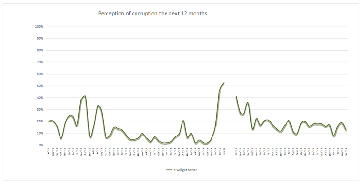 2018 දෙවන කාර්තුව (අප්රේල්, මැයි, ජුනි) තුළදී මෙම බලාපොරොත්තුව පහළ ගිය අතර යළිත් එය 2018 ජූලි මාසයේදී කැපී පෙනෙන ලෙස වර්ධනය වී තිබෙන ආකාරයත් පසුව එය ක්රමයෙන් පහළ ගිය ආකාරයත් පහත ප්රස්ථාරයෙන් දැක්වේ. මෙහිදී, වැදගත් වන්නේ සමස්තයක් ලෙස තුන්වන කාර්තුව තුළදී දූෂණය අඩුවන බලාපොරොත්තුව ඉහළ ගොස් තිබීමයි.