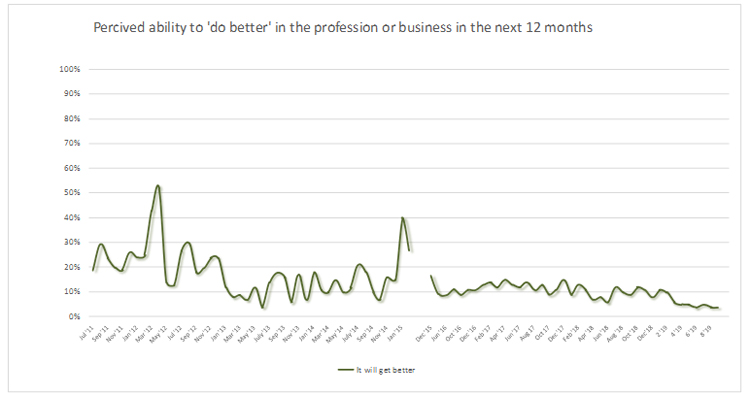 මෙම අපේක්ෂාව 2019 ජනවාරි, පෙබරවාරි, මාර්තු යන කාර්තුව තුළදීත්, අප්රේල්, මැයි, ජුනි කාර්තුව තුළදීත් පහළ ගිය අතර 2018 හතරවන කාර්තුව තුළදීත් පහළ ගියේය. මීටපෙර, 2018 තුන්වන කාර්තුව තුළත් ඉදිරි මාස 12 සැලකිල්ලට ගත්කළ තම රැකියාවේ තත්ත්වය හෝ ව්යාපාරය වැඩි දියුණු කර ගැනීම කෙරෙහි ජනතාවගේ අපේක්ෂාව පහළ ගොස් තිබුණි.