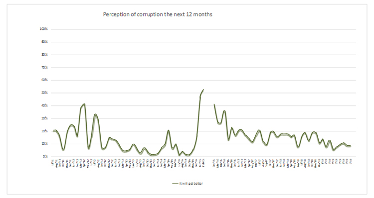 2018 හතරවන කාර්තුවේදී පහළ ගිය මෙරට දූෂණය අඩුවන බලාපොරොත්තුව 2019 පළමුවන කාර්තුව (ජනවාරි, පෙබරවාරි, මාර්තු) තුළදී යළිත් ඉහළ ගිය අතර එය 2019 දෙවන කාර්තුව (අප්රේල්, මැයි, ජුනි) තුළත් අඛණ්ඩවම වර්ධනය වුණි. එය නැවතත් 2019 තුන්වන කාර්තුව තුළදී පහළ ගොස් ඇත.