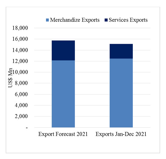 2021 ජනවාරි සිට දෙසැම්බර් දක්වා කාලය තුළ, ඔක්තෝබර් සිට දෙසැම්බර් දක්වා ඇස්තමේන්තුගත සේවා දත්ත ඇතුළුව අපනයන ඉපැයීම් ඇමෙරිකානු ඩොලර් බිලියන 15.12ක් වාර්තා කර ඇති අතර සංශෝධිත අපනයන ඉලක්කයෙන් 96.2%ක් ලබාගෙන ඇත.