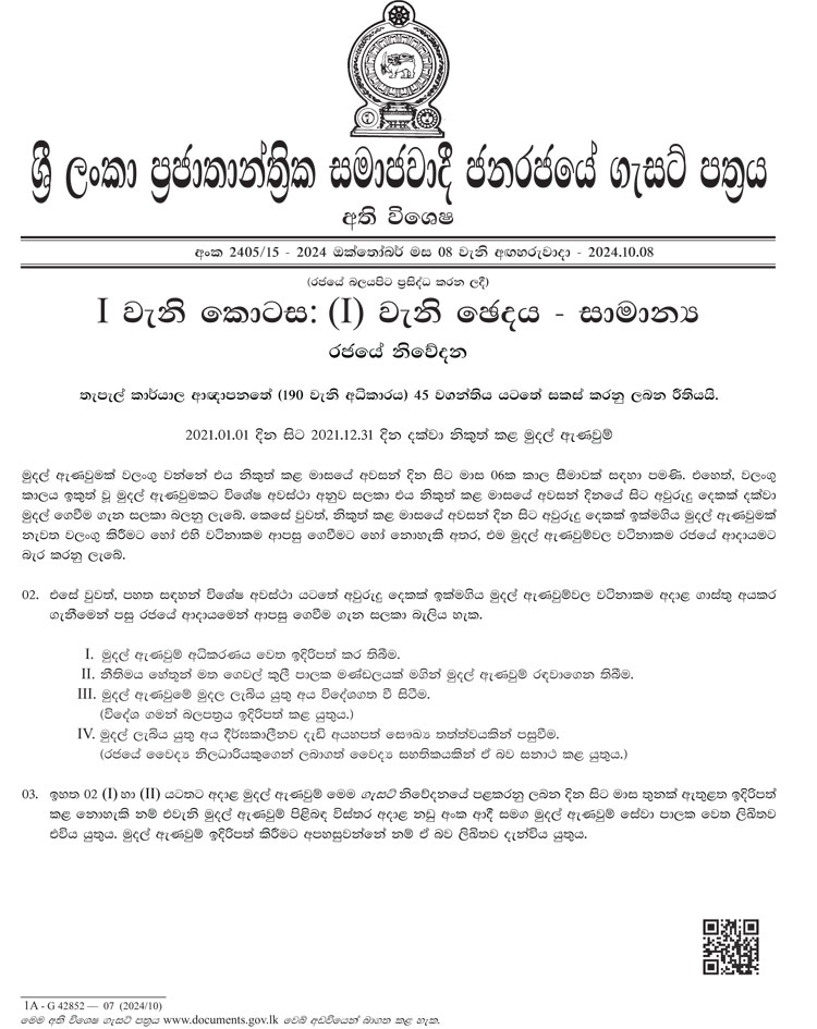 2021 ජනවාරි 01 සිට 2021 දෙසැම්බර් 31 දක්වා වසර තුළ නිකුත් කළ නමුත් කල් ඉකුත් වී ඇති මුදල් ඇණවුම්වල වටිනාකම විශේෂ අවස්ථා කිහිපයක් යටතේ, රජයේ ගාස්තු අයකර ගැනීමෙන් පසු රජයේ ආදායමෙන් නැවත ගෙවීම පිළිබඳව මෙම ගැසට් නිවේදනය අදාළ වනු ඇත.