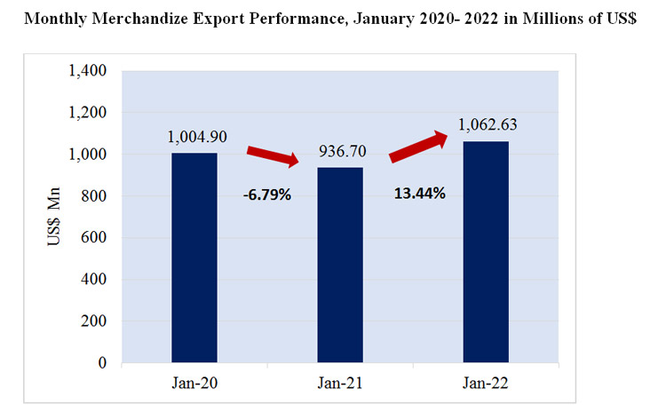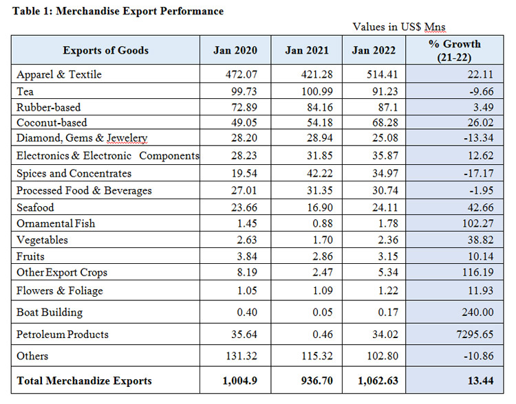 ශ්රී ලංකා රේගුව විසින් නිකුත් කරන ලද දත්තවලට අනුව 2021 ජනවාරි මාසයට සාපේක්ෂව 2022 ජනවාරි මාසයේ දී ශ්රී ලංකාවේ වෙළඳ භාණ්ඩ අපනයනය ඇමරිකන් ඩොලර් මිලියන 1,062.63 දක්වා, 13% කින් වැඩි විය. එය 2020 ජනවාරි මාසයට සාපේක්ෂව 5.7% ක වැඩිවීමකි.